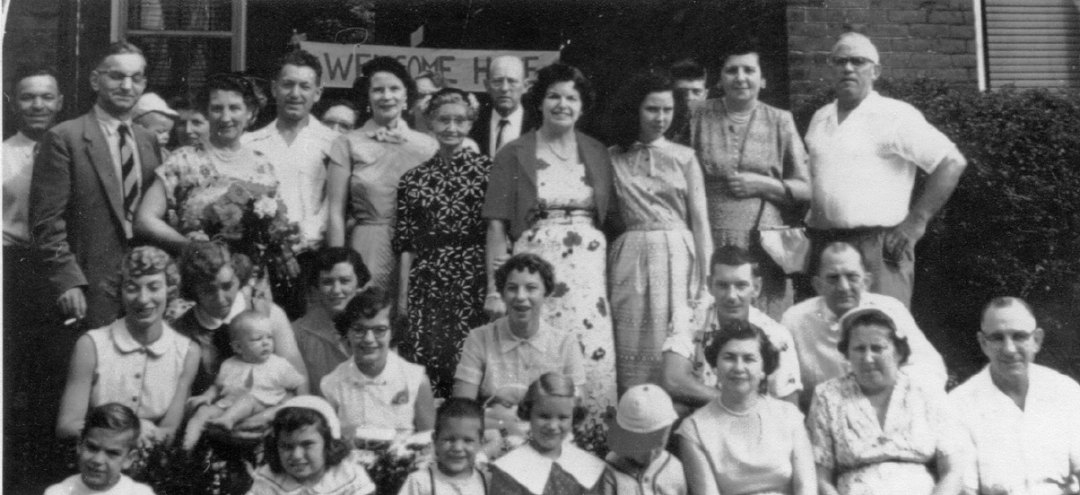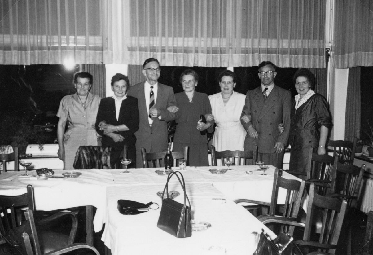Familientreffen Münster 1954: vlnr.: Maria Hasters, Hermine Strothmann, Ernst Schumacher, Liesbeth Jünk, Berta Lange, Alois Schumacher, Liesel Schnermann